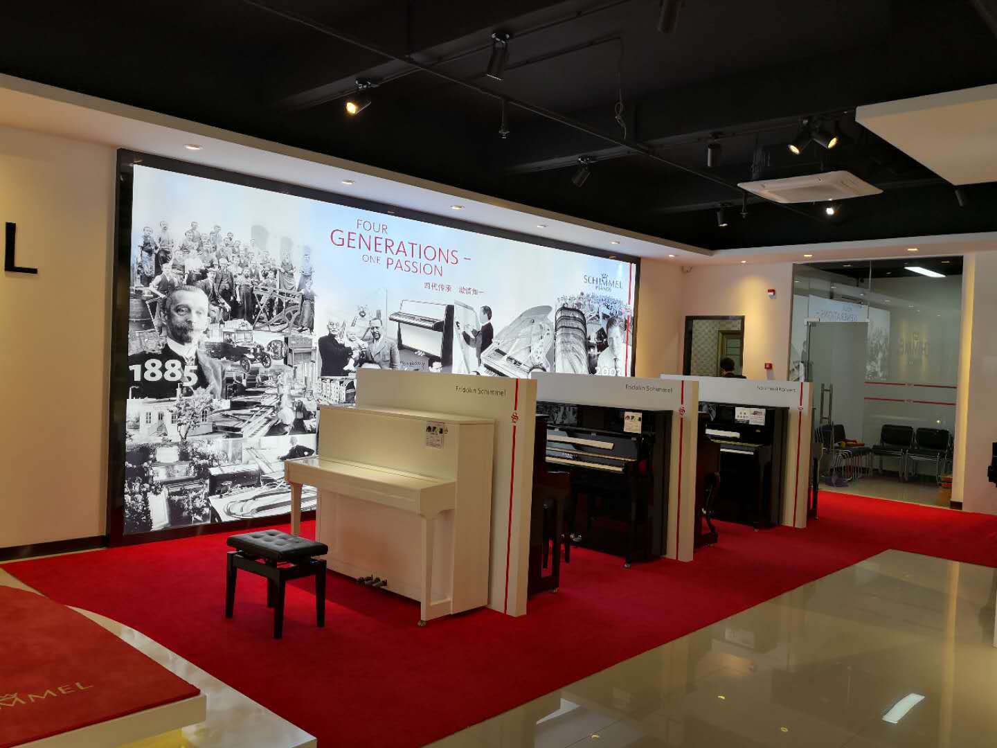 SCHIMMEL鋼琴深圳專賣店按照德國SCHIMMEL鋼琴公司要求的專賣店形象打造,店面內(nèi)鋼琴的陳設、掛畫的擺放、主墻面的設計及地毯的鋪設都帶有濃厚的品牌元素。店面明亮整潔,精致大氣,保持德國制造的一貫嚴謹而又精致的傳統(tǒng)。