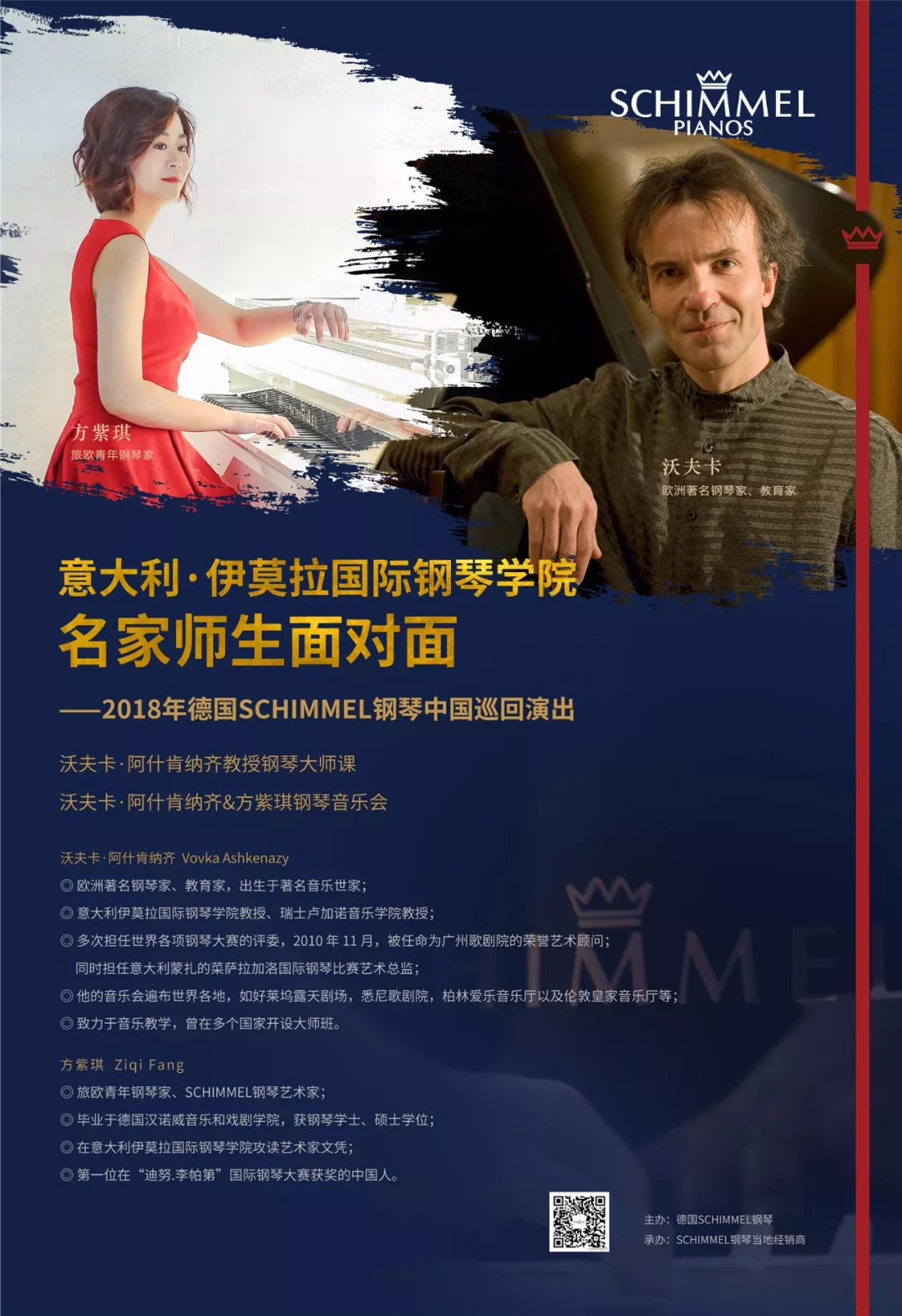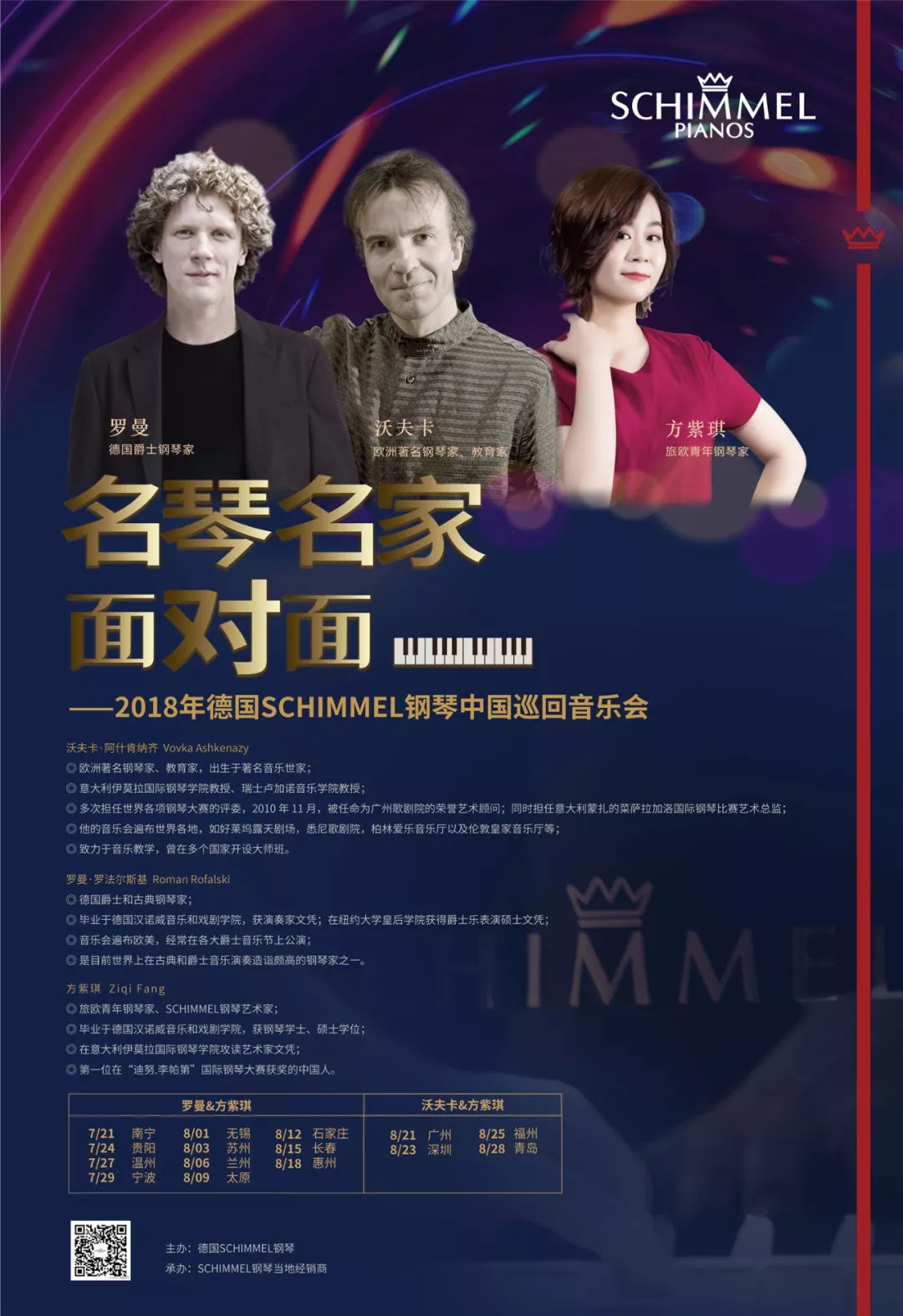 2018年SCHIMMEL鋼琴中國巡回音樂會已經啟動!今年,SCHIMMEL鋼琴邀請了3位鋼琴家——歐洲著名鋼琴家、教育家沃夫卡·阿什肯納齊;德國古典和爵士鋼琴家羅曼·羅法爾斯基以及旅歐青年鋼琴家、SCHIMMEL鋼琴藝術家方紫琪共同完成此次的音樂之旅。