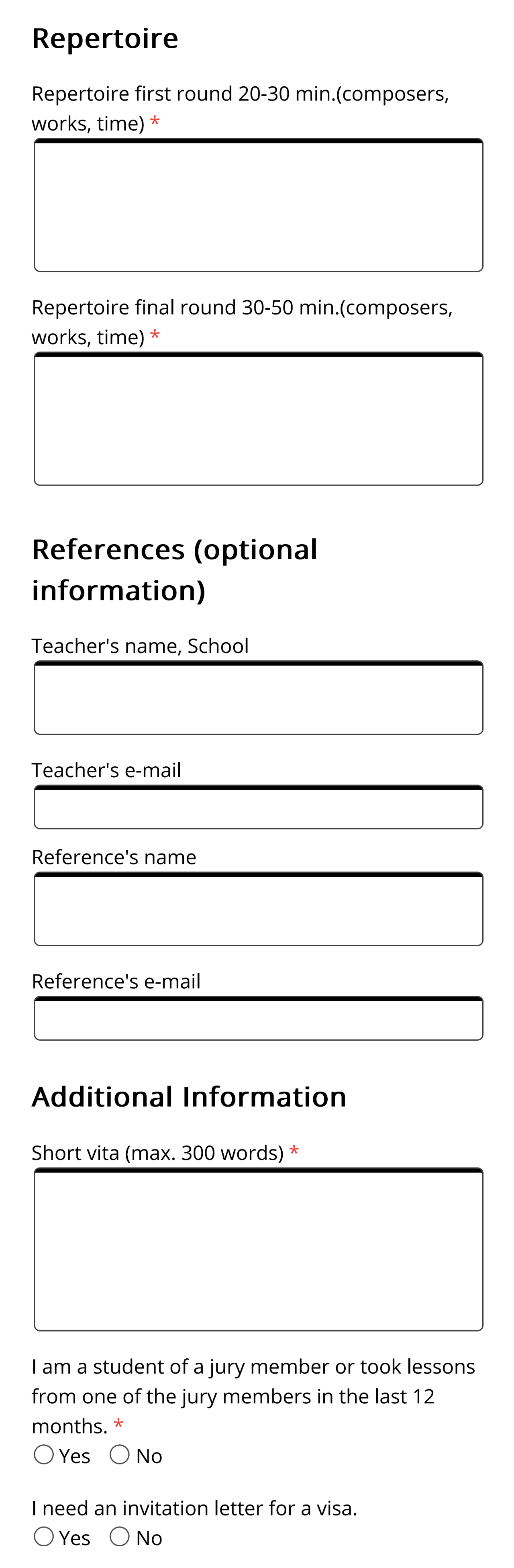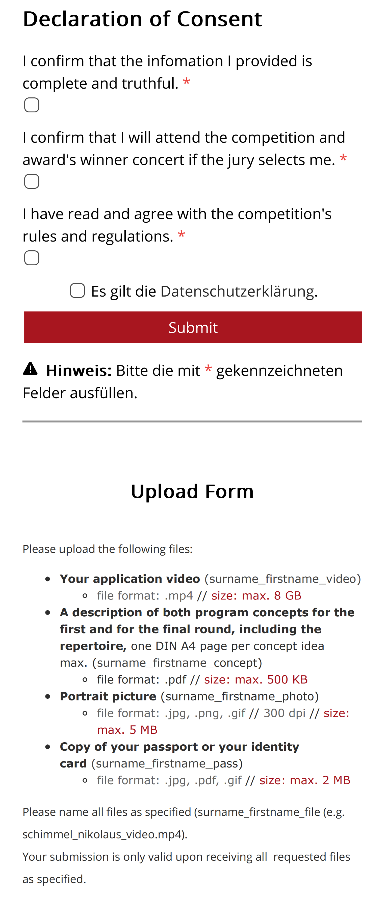 但目前有些報名參加比賽的選手反饋無法順利上傳報名信息,為確保選手的報名資料能按時順利遞交到德國評委會,對此,我司在與德國積極協商后,德國舒密爾鋼琴公司允許舒密爾鋼琴(中國)有限公司協助收集無法順利在大賽網站報名的參賽者信息,幫助有意向的參賽選手報名再轉交給德國評委會。