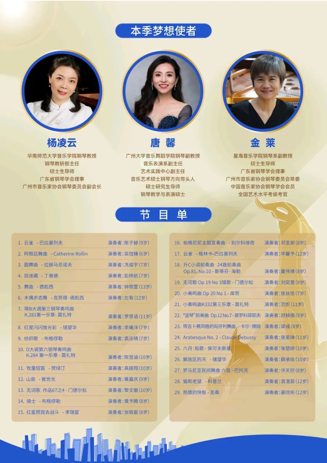 每一屆的“羊城小鋼琴家”活動(dòng)都會(huì)聘請(qǐng)三位高校的鋼琴專(zhuān)家教授作為孩子們的“夢(mèng)想使者”,引領(lǐng)孩子們追逐鋼琴夢(mèng)想,本屆聘請(qǐng)了楊凌云老師、唐馨老師、金萊老師擔(dān)任“夢(mèng)想使者”。