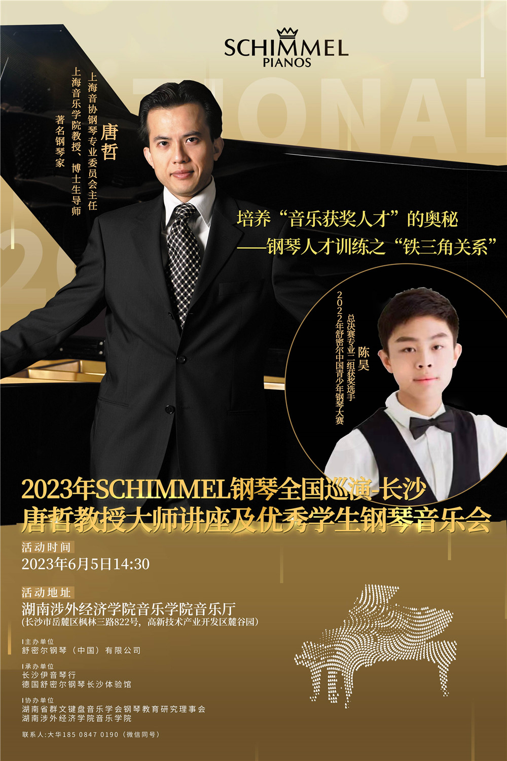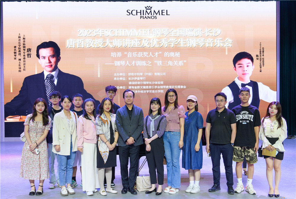 6月5日,由舒密爾鋼琴(中國)有限公司主辦,長沙伊音琴行與德國舒密爾鋼琴長沙體驗館承辦,湖南省群文鍵盤音樂學會鋼琴教育研究理事會與湖南涉外經濟學院音樂學院協辦的唐哲教授大師講座及優秀學生鋼琴音樂會在湖南涉外經濟學院音樂學院音樂廳成功舉辦。