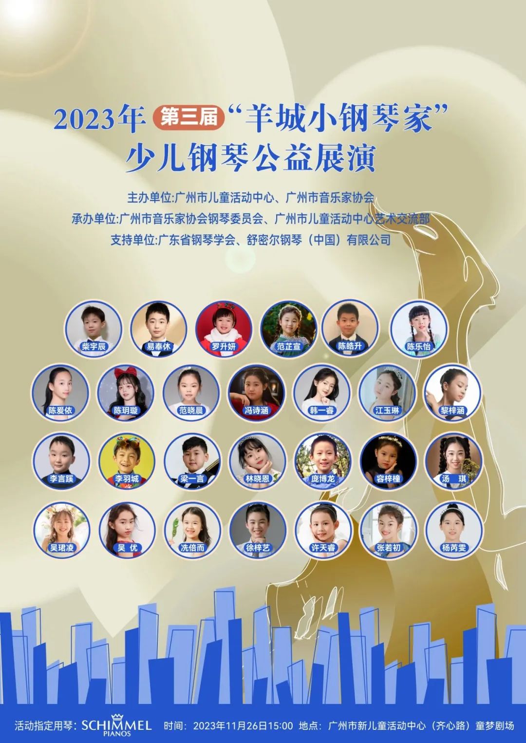 由廣州市兒童活動中心與廣州市音樂家協會共同主辦的“羊城小鋼琴家”少兒鋼琴公益展演于昨日在廣州市新兒童活動中心童夢劇場舉行,本次活動邀請了優秀小鋼琴家為觀眾帶來精彩演奏,活動指定用琴為舒密爾鋼琴。