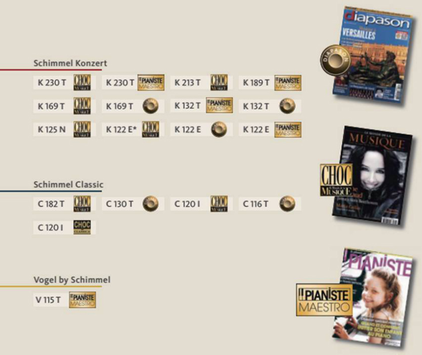 在法國專業音樂期刊Le Monde de la Musique(《音樂世界》)舉辦的傳統樂器測評中,SchimmelK175獲得的評價讓我們備感驕傲:“K175充滿魅力,音色像天鵝絨般溫暖、自然,適合演奏所有曲目...它有著貴族鋼琴的特性——生產工藝精湛、音調豐富,是一款專為音樂家而設計的高品質鋼琴?!?/span>