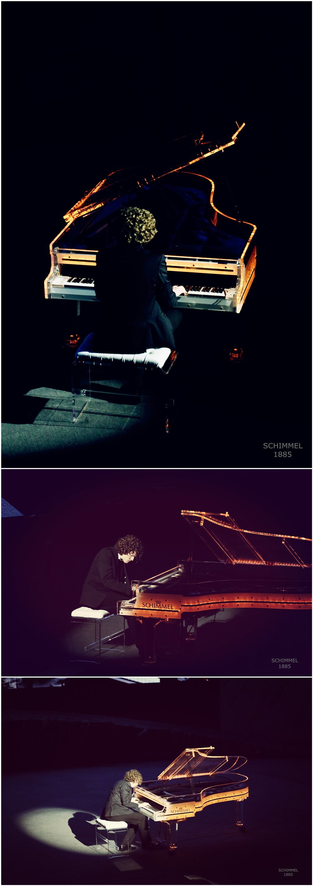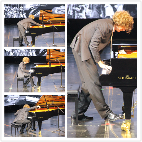 音樂會上首次采用雙鋼琴的表演形式,SCHIMMEL九尺演奏會鋼琴用于古典音樂的彈奏,音樂會下半場爵士專場則采用SCHIMMEL水晶鋼琴進行表演,兩架鋼琴同時擺放在旋轉舞臺之上,上半場結束之后,舞臺自行旋轉切換,賺足觀眾眼球。
